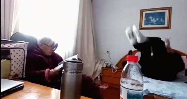 平时的话,小伙子就在家里面陪着奶奶,然后提醒奶奶吃药什么的,然后帮忙拿水吃药。有一段视频中,小伙子躺在床上看电视,而她的奶奶就在旁边戴着眼镜安静地看书。