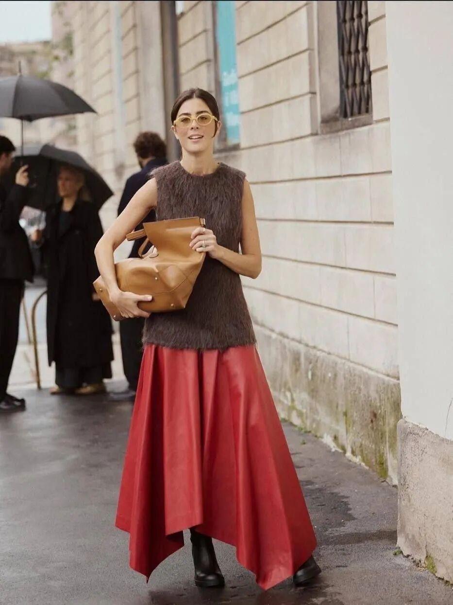 搭配一件黑色高领毛衣,或是深棕色的皮衣,让彩色裙摆成为沉闷中的那抹亮色。