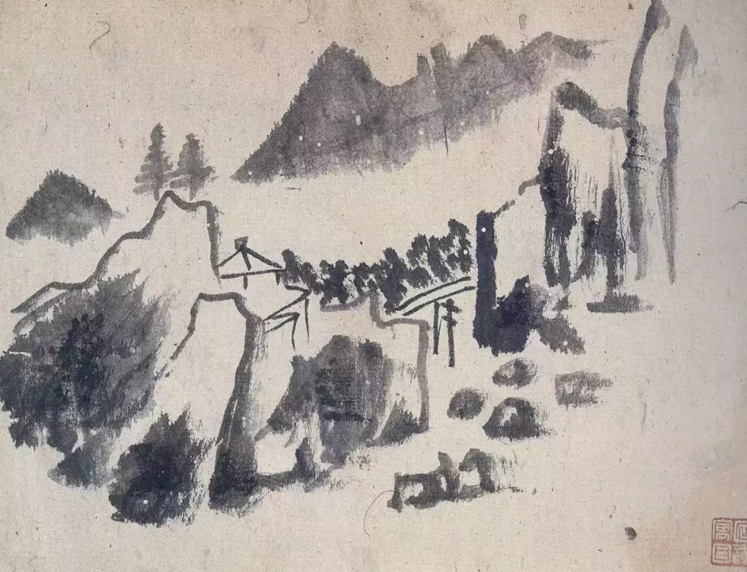 担当和尚的画,不拘泥于形,更重神韵。他笔下的山石,侧峰一扫,峭壁就立起来了,生辣得很,像是刀削斧砍一般。水墨上,他继承了董其昌的淡雅,又融入了倪云林的孤寂,但比董其昌多了几分刚劲,比倪云林多了几分生机。