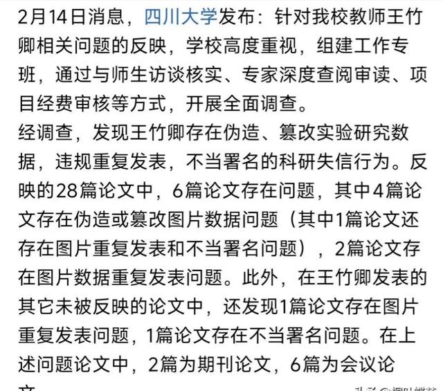 先说第一点,王竹卿进川大也就5年,带的学生就一两届,学生跟着他做课题的时间也不算长,就算真有问题,也没到那种特别严重,完全收不住的程度,跟那些在高校里深耕十几二十年的导师不一样,那种人如果出事,往往是问题堆了很多年,越挖越深,想捂都捂不住。