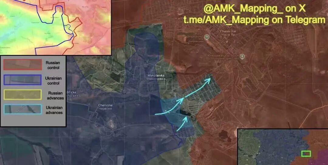 乌军在恰索夫亚尔方向的反攻,夺回了恰索夫亚尔变电站和污水处理厂,随后向东北方向推进,攻入邻近的舍甫琴科区。