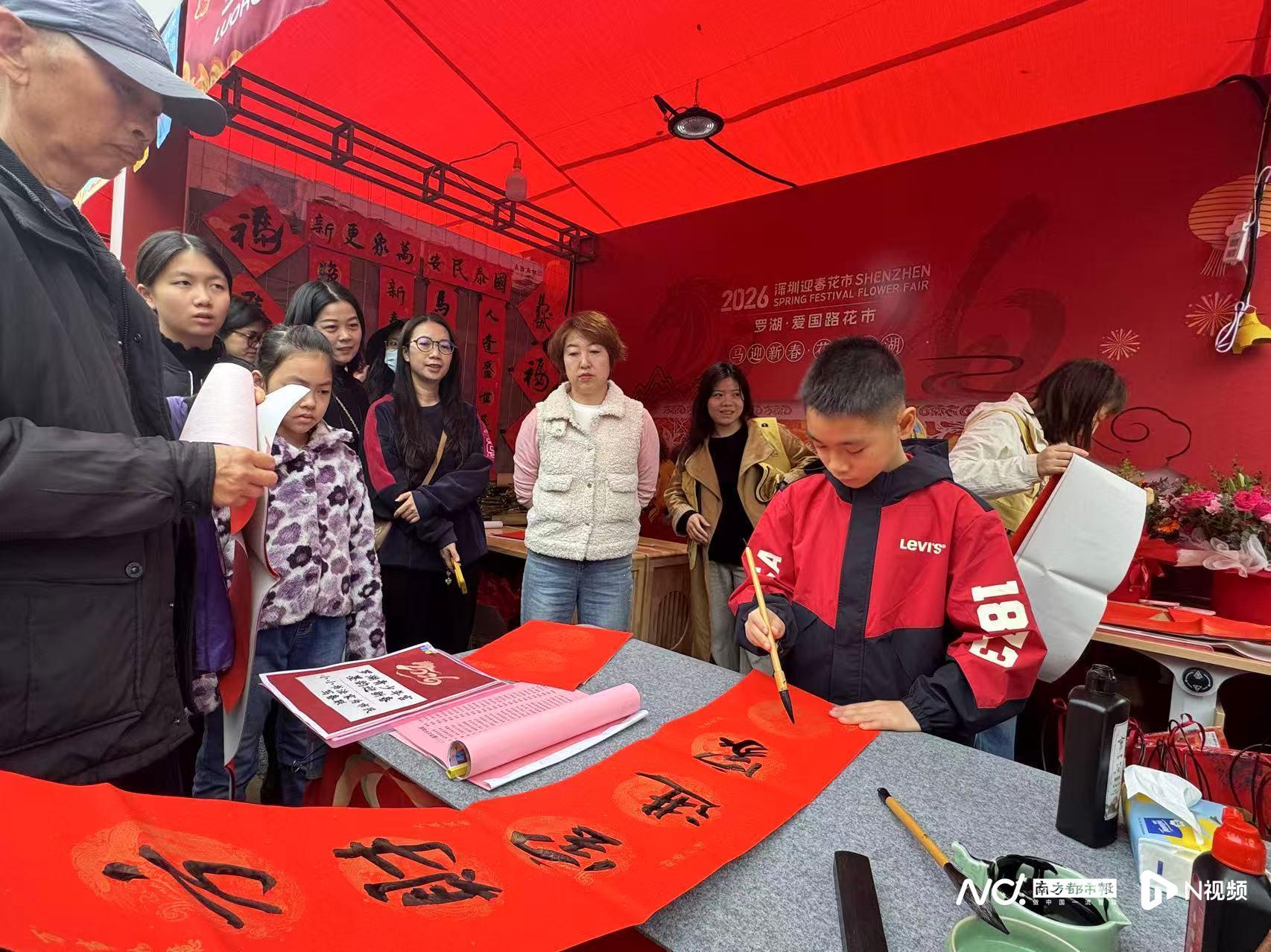 罗湖青少年宫工作人员黄珊盈告诉记者,擅长书法的五年级学生梁同学一站就是三四个小时,为大家免费写书签、送福字,一天派单数量达210份,收获连连称赞。