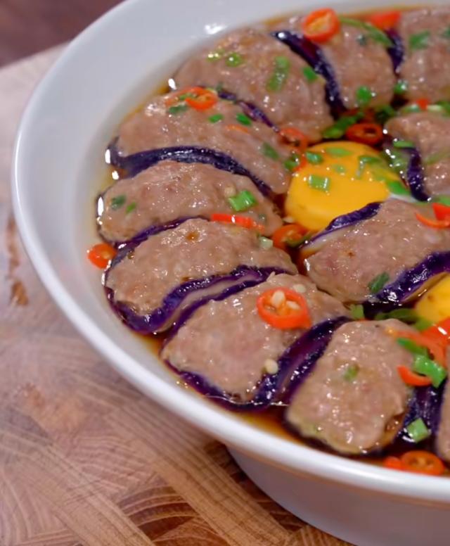 - 泡至柔软不断的茄子片,放上肉馅按压紧实,摆入盘中,中间打入 3 个鸡蛋。