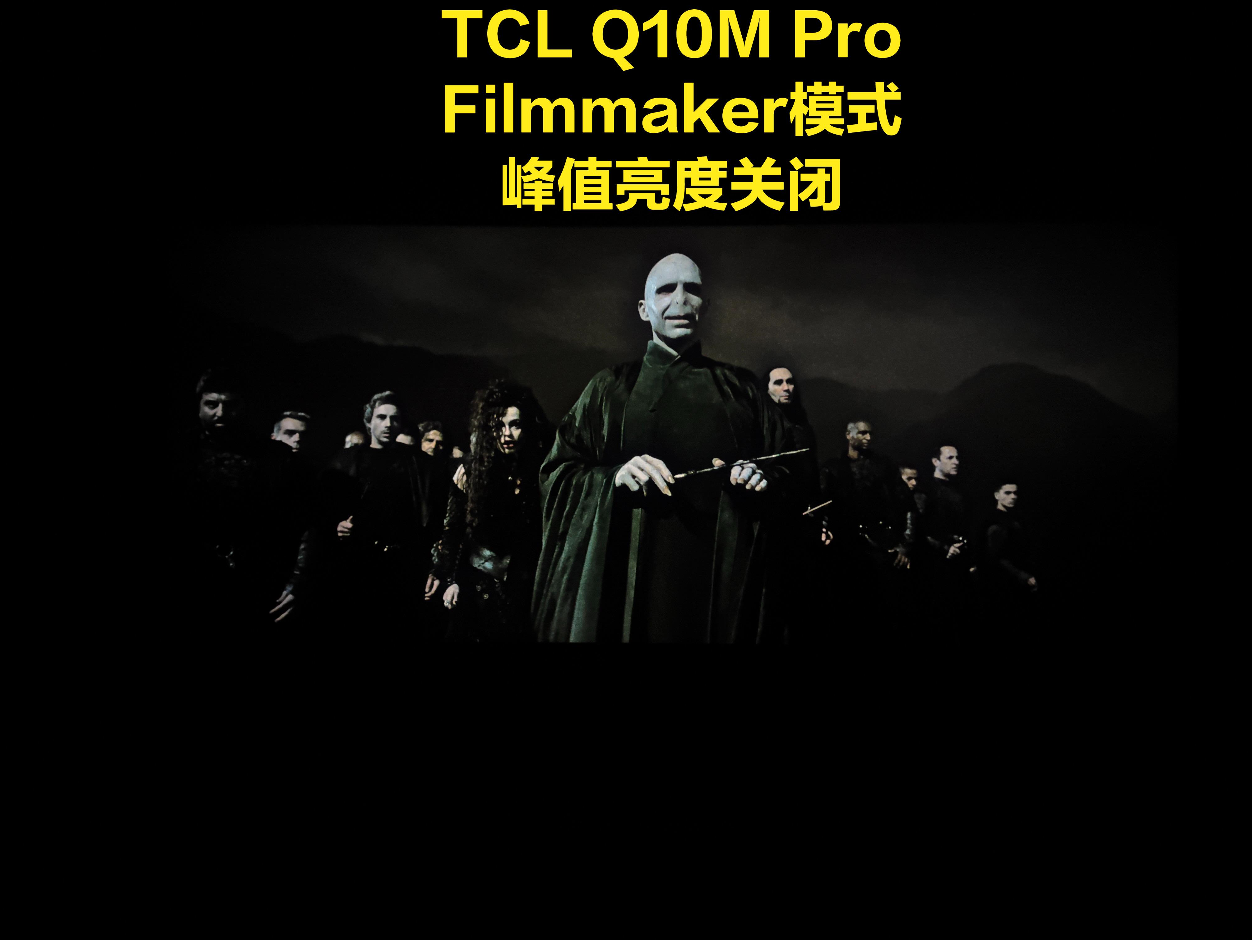 相比起《权游》,《哈利波特7下》这个画面的亮度就明显要高不少,当然整体也算不上极暗,放大还能看到背景不同灰阶的细节表现。所以理论上,这样的画面在电视的Filmmaker模式下应该更接近原始的画面。我们还是先用Q10M Pro在Filmmaker模式下进行不同峰值亮度下的画面对比。