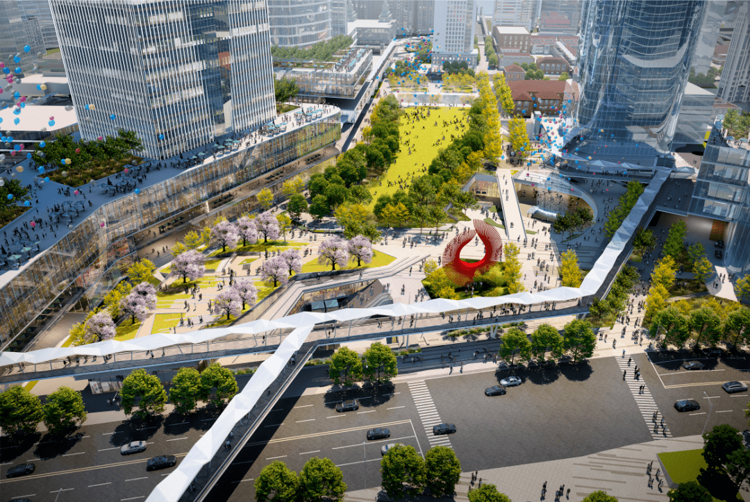 约6公顷中央绿地延展至黄浦江畔,堪比曼哈顿中央公园,更是与空中的连廊、地下的空间、周边的建筑构成上海核心区难得一见的立体生态体系!