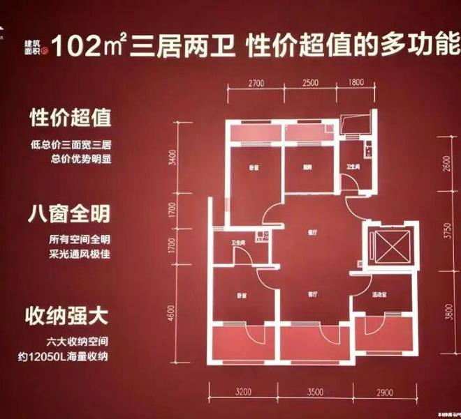 · 97-102㎡三居两卫:两梯两户,南向三开间面宽约9.6米,八窗全明,采光与通风性能突出,适合改善型及二胎家庭。