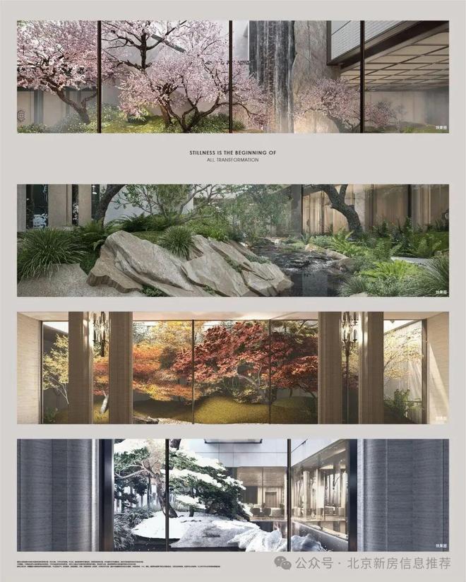 溯源京城九大皇家御苑胜境,融贯非遗匠心营筑"一园一叙"的人文景致。春棠堆雪、夏藤绕廊、秋栌流金、冬松卧玉,四时风物长新;造园技艺与珍材甄选的集萃之作,不止为栖居之所,更是文明根脉的当代延续与心灵栖居之境。