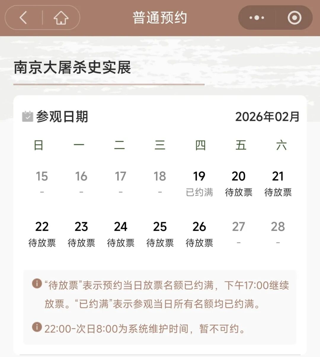 侵华日军南京大屠杀遇难同胞纪念馆、南京大屠杀史实展2月19日已约满,2月20日至2月26日预约显示待放票状态。