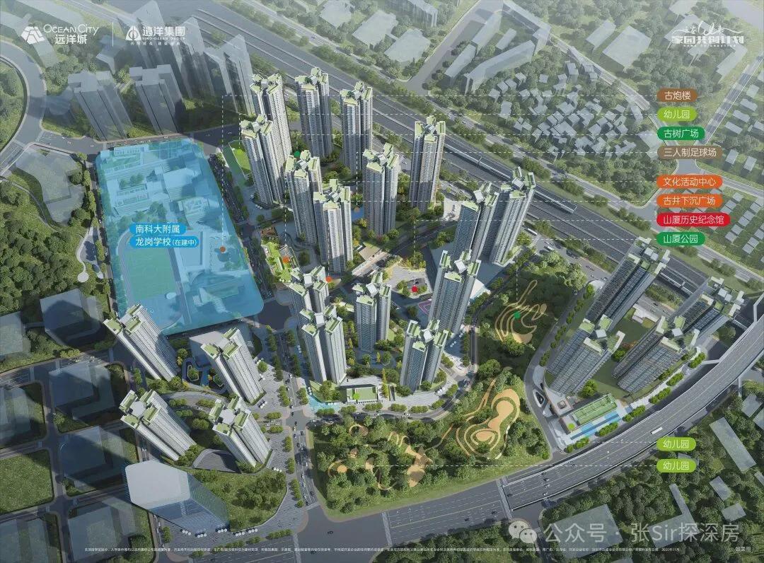 深圳远洋城,百万方全生命周期大城,与城共融共成长。配套家门口南科大附属龙岗学校(在建),家门口山厦公园,规划3所幼儿园、约4万平米商业、文化活动中心、文化主题园林、四大主题架空层等,匠造百万大城生活。