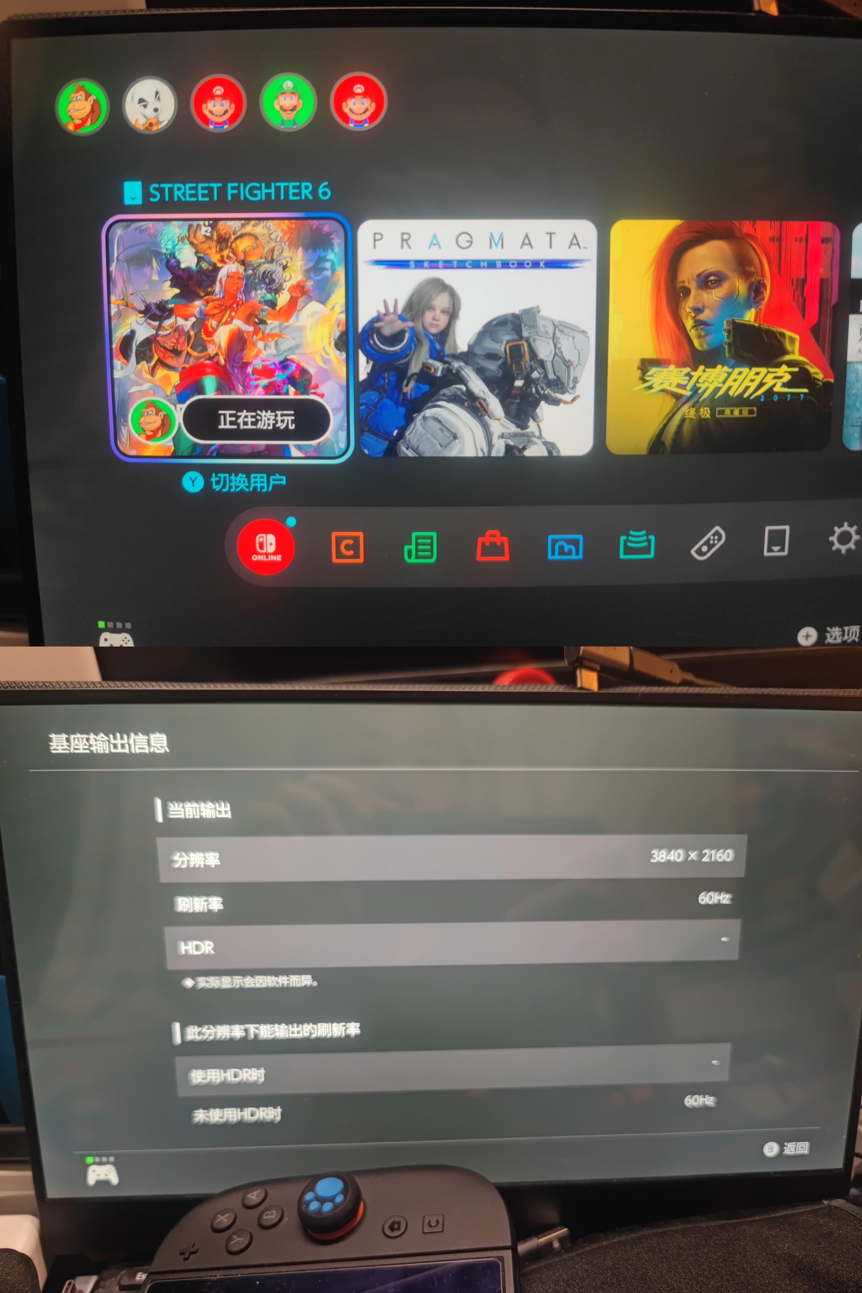 2、我有两个32寸的台式4k显示器,一个便携4k显示器,也都支持hdr,有一台支持4k 120hz,并且支持一线通C口视频输入及65w反向充电。本来它可以一线插Switch1代都不用插电源的,2代因为特殊协议就只能用这个拓展坞了。但是,C口用这个拓展坞貌似只能支持1080p,不支持120hz。如果是4k就变成了蓝色基底浅色发白的效果,不知道怎么回事儿(由于这台显示器HDMI2.1的接口被ps5和xsx占上了,我本身买这个拓展坞也只是为了接AR眼镜,就懒得测试了)