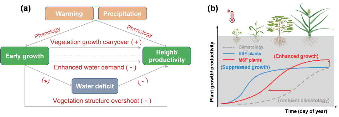 图4. 增温和降雨变化条件下不同开花功能群植物物候变化及其对植物生长以及生物量生产力效应的概念图。