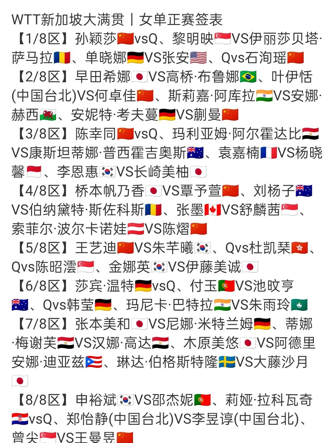 看好黑马突围,毕竟竞技体育就是因为有参考资料:央视新闻 WTT新加坡大满贯正赛签位公布