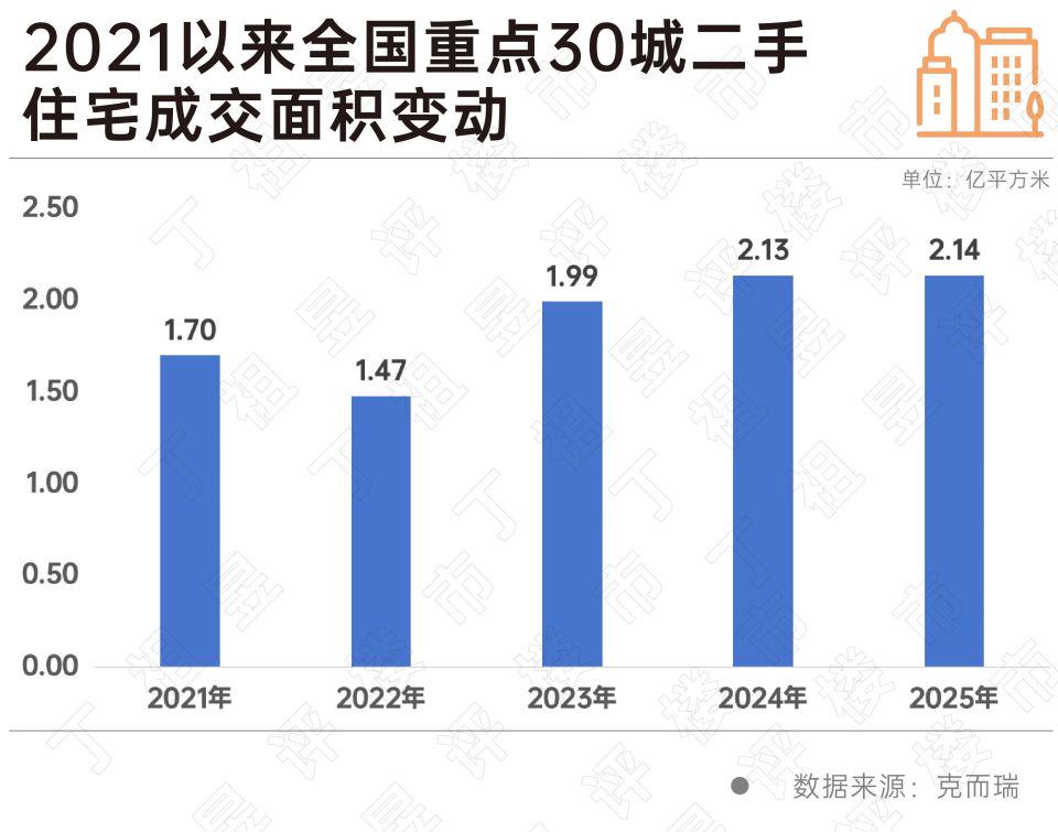 2025年全国二手房成交总量创新高,重点30城市二手住宅累计成交面积约2.14亿平方米,为新房面积的1.85倍。