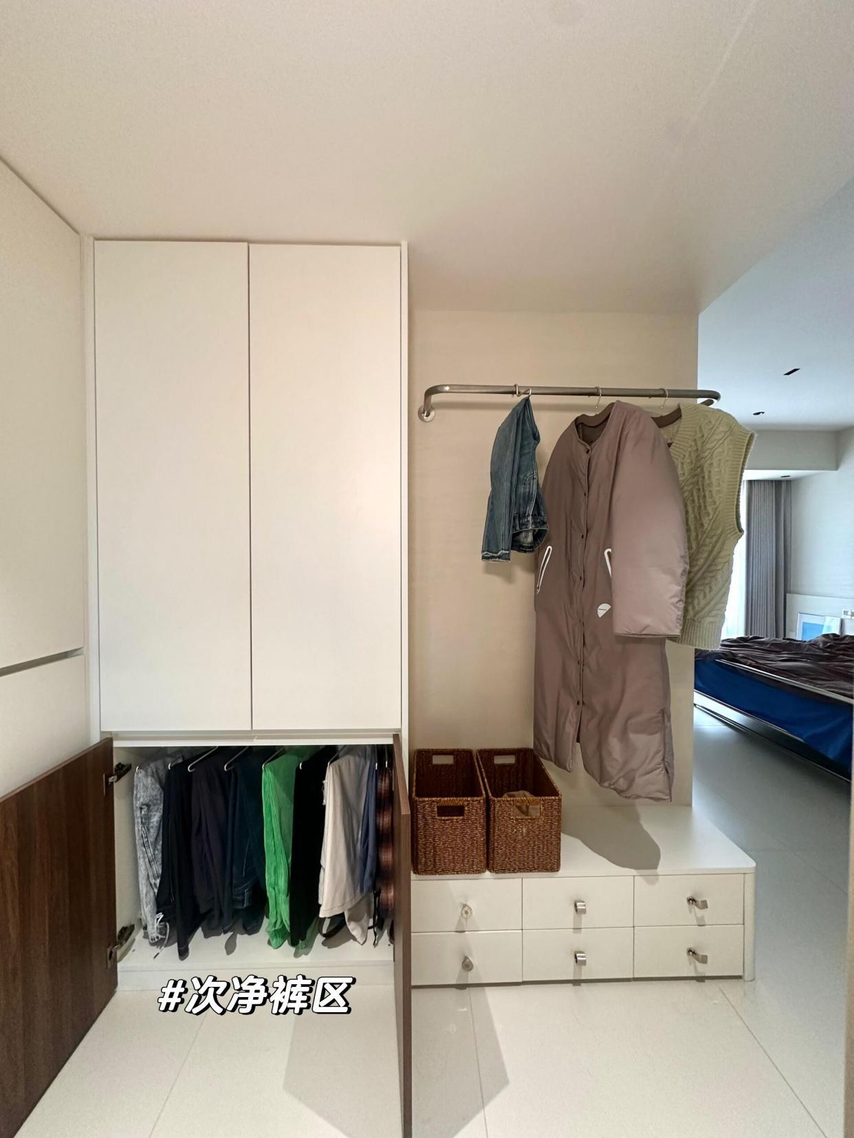 她是将卧室柜子的L型的部分,做成了次净衣区,外套挂外侧,裤子挂柜内。