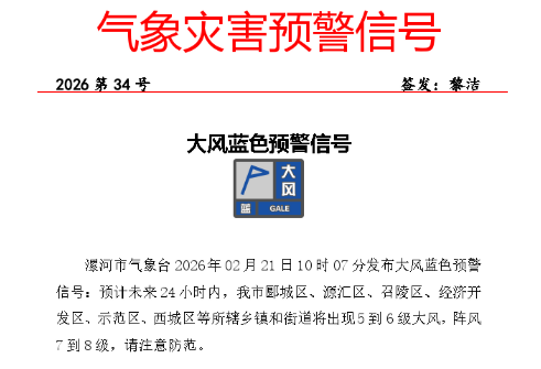 漯河市气象台2026年02月21日10时07分发布大风蓝色预警信号:预计未来24小时内,我市郾城区、源汇区、召陵区、经开区、示范区、西城区等区域所辖乡镇和街道将出现5到6级大风,阵风7到8级,请注意防范。