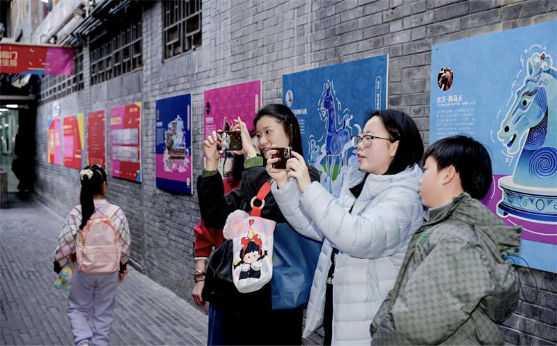 走进“瑞马临门·古巷生辉”宽径智趣艺术走廊,这里以四川出土的12件马文化文物为原型进行数字艺术再创作,观众扫码即可唤醒AR立体神骏,实现历史文物与数字艺术的跨时空对话。街区内还设置多处AR互动点位,扫描宽窄字牌、拴马石、如意墙等地标,就能触发古建筑光影、川剧熊猫、舞狮熊猫等动态效果,让藏在砖石间的城市记忆以数字化形式生动呈现。
