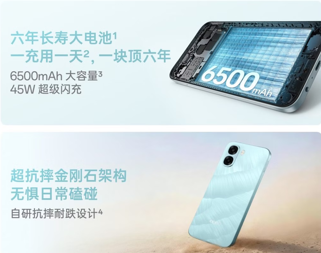 6500mAh电池——这是什么概念?iPhone 16 Pro Max是4685mAh,这货直接多出将近2000mAh。更离谱的是官方喊出的口号:"六年长寿大电池"。不是六年保修,是承诺电池健康度扛六年。我第一反应是:OPPO的市场部是不是喝高了?千元机用户平均换机周期也就两年半,你跟我说六年?