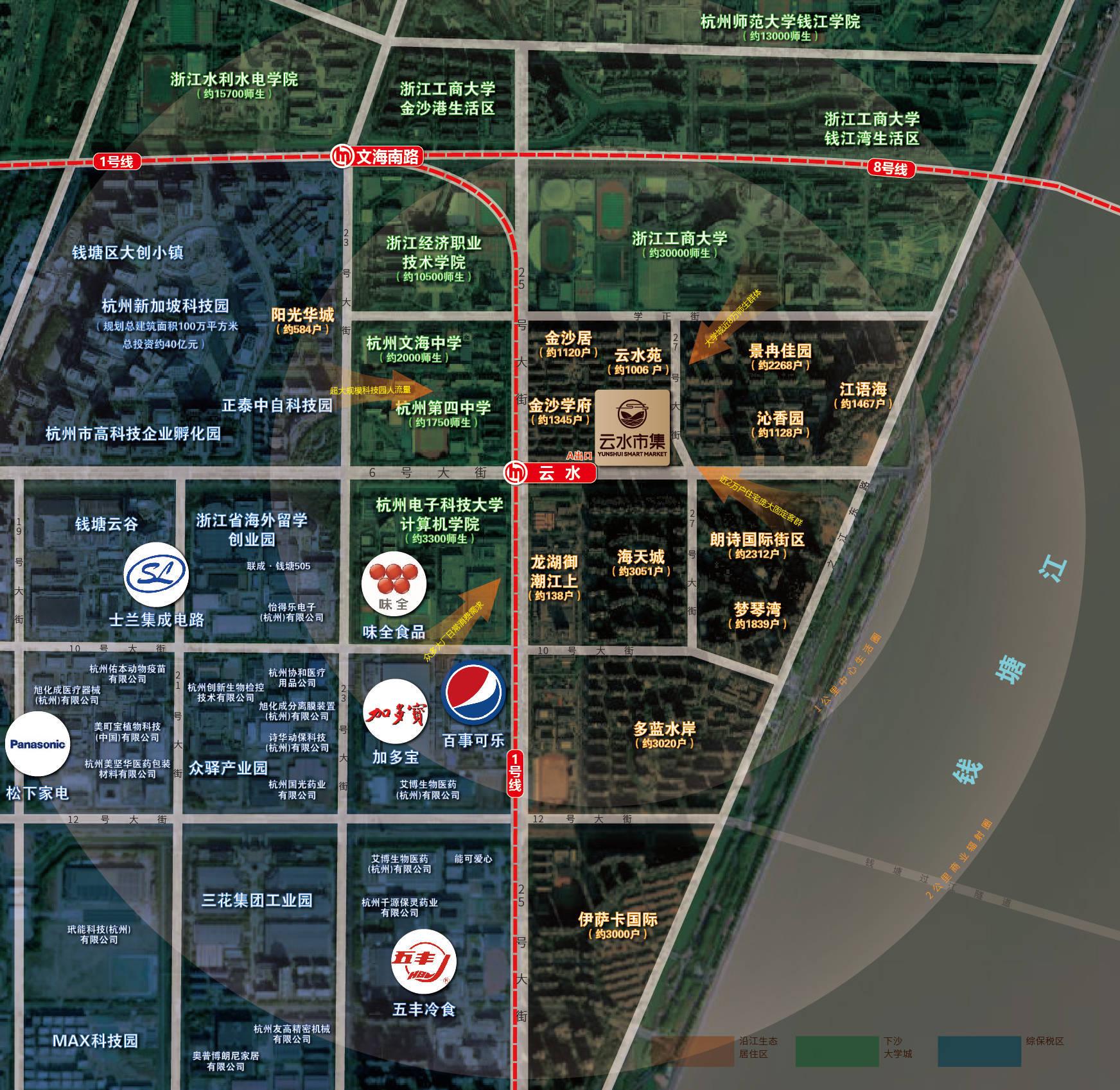 地域优势:下沙核心,杭州最具代表性的产城、高校联合联合板块,辐射周边2公里23万居民,步行可达性强,满足日常高频采购需求。