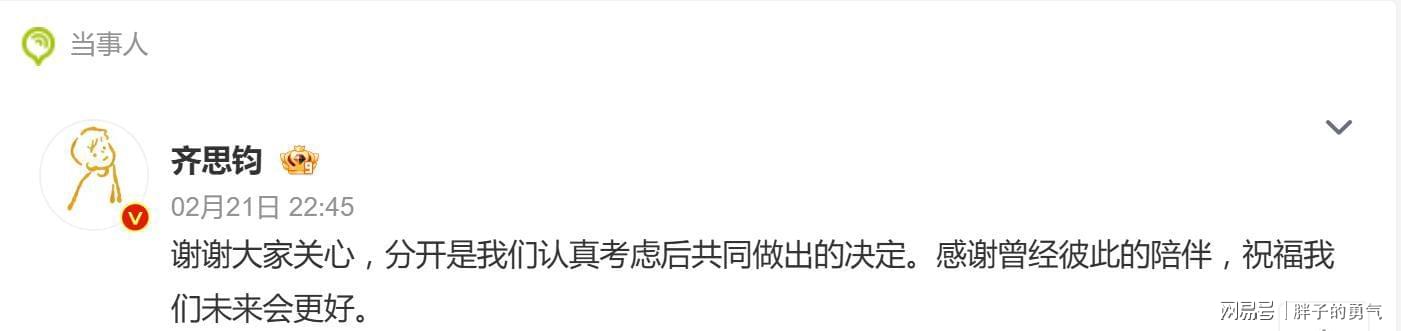 2月21日晚22:45,齐思钧在微博写下:“谢谢大家关心,分开是我们认真考虑后共同做出的决定。感谢曾经彼此的陪伴,祝福我们未来会更好。”言辞简洁,态度清晰。而这份声明,与刘梦章早前在个人视频中的坦诚剖白,形成了高度一致的“联合公告”。