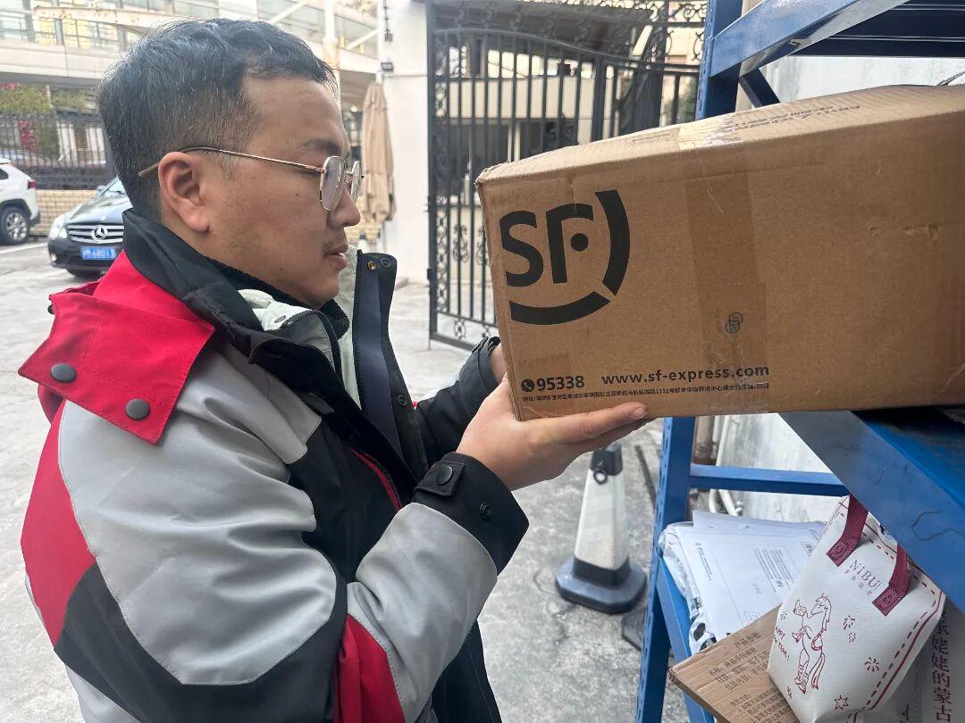 来沪八年,这位四川汉子早已摸清这片街区的每一处弯道、每一个门牌。扫码、核对、递送,一套动作行云流水。“您好,顺丰快递。”这句重复了无数遍的话语,他依然说得清晰有力。