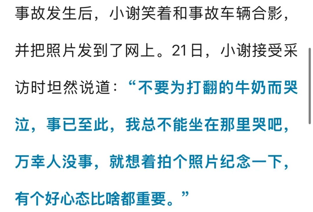 事发后,小谢乘坐家人的车辆平安返回。目前,该起事故的责任认定工作正在进行中。