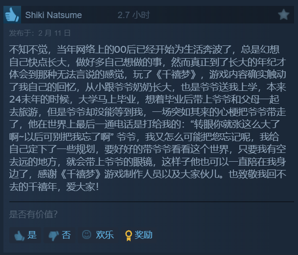 《千禧年》的Steam评论区除了少数几个认真评测,90%都是聚焦游玩时如何触景生情。
