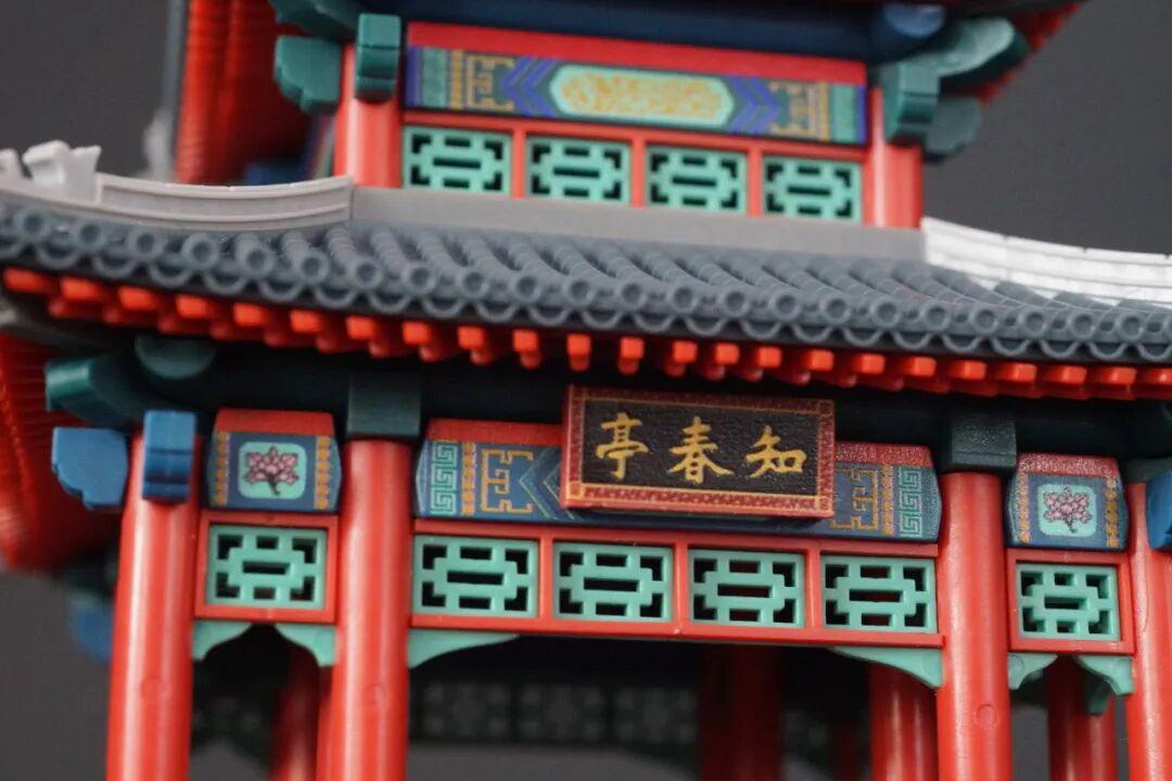 不是特别好拼,需要辨识相似零件和一些零件的朝向。拼好后相当还原,一看就知道是那个亭子