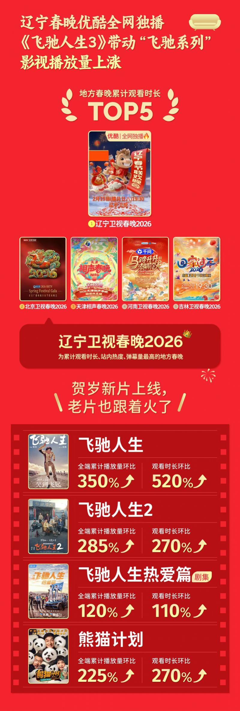 线上方面,经典影视内容在春节期间再次被激活。春节档电影《飞驰人生3》带动站内同名IP系列电影、剧集如《飞驰人生热爱篇》等观看显著回升,经典内容如《甄嬛传》《重返狼群 10周年特别纪念版》也迎来补番热潮。优酷全网独播的《2026辽宁春晚》在地方春晚中累计观看时长、站内热度及弹幕量均排名第一。