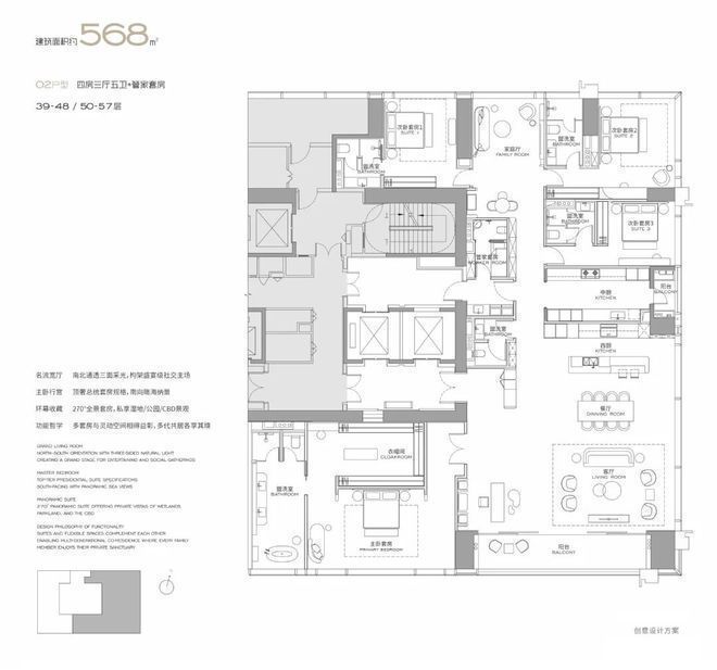 户型亮点:全套房设计+家政套间,适配多代同堂或高端社交需求;超大观景面,景观资源优越;全球大师定制空间,居住与社交属性兼具,是塔尖家庭的核心居住选择。