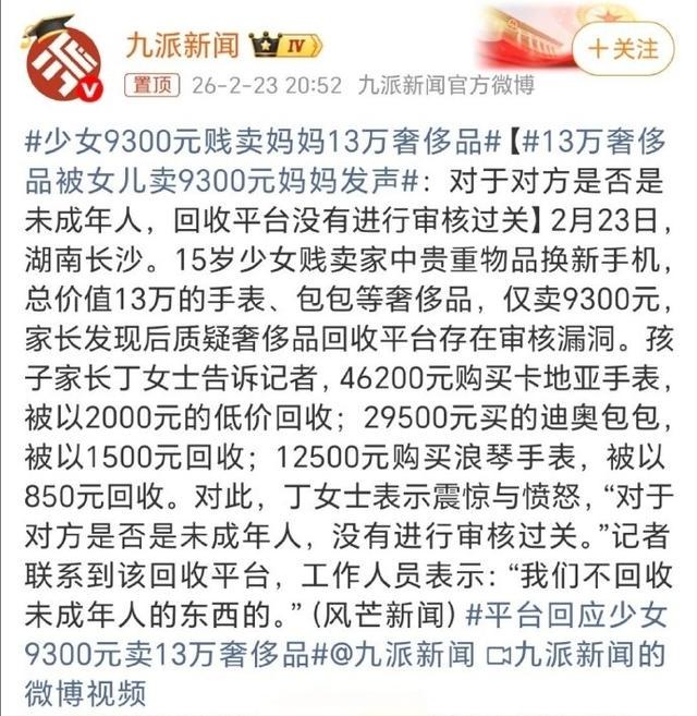2月23日,湖南长沙。15岁少女为购买新手机,与同学分工,分6次将家中总价值约13万元的手表、包包等奢侈品贱卖,仅换得9300元,原价4.62万元的卡地亚手表以2000元回收;原价2.95万元的迪奥包仅售1500元;原价1.25万元的浪琴手表以850元成交。总价值13.2万元的物品最终仅得9300元,价差达14倍,家长发现后质疑二手奢侈品回收平台存在审核漏洞及平台利用信息不对称恶意压价。