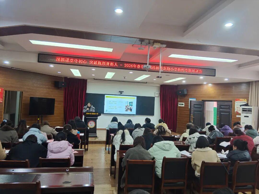 为进一步夯实课堂教学根基,破解教研工作瓶颈,提升教师专业素养与教学能力,2026年2月新学期即将到来之际,桂林市龙隐小学彭雪副校长在新学期工作部署会议室上为全校教师带来了以“深耕课堂守初心 突破瓶颈育新人”为主题的教学教研专题培训,全体教师共同参与学习、交流探讨。