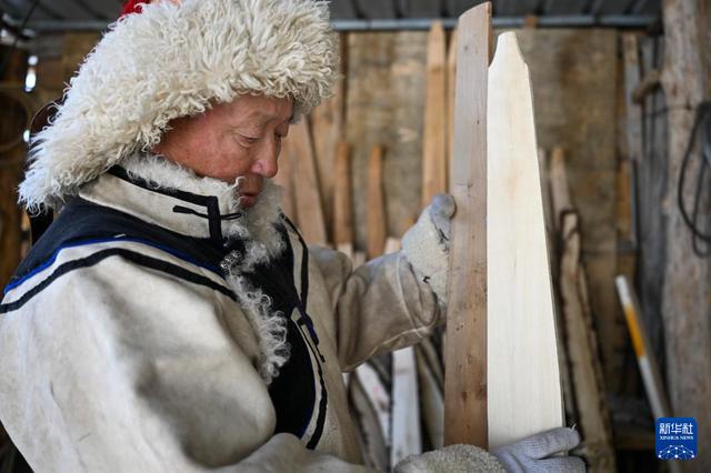 时下的阿勒泰,莽莽雪原银装素裹,最低气温仍低于零下二十摄氏度。在新疆阿勒泰市汗德尕特蒙古族乡汗德尕特村,非遗匠人铁木尔加甫·卡汗别力克挥斧刨木、鞣皮绑绳,一副副承载古老智慧的毛皮滑雪板在手中成型。