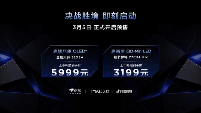 至于大家关心的价格,确实也是一文钱一文货,也是对标目前高端显示器设定。“全能至臻”32X3A上市首发价5999元,“细节悍将”27C3A Pro上市首发价3199元,即日起在TCL官方商城及各大合作平台开启预售;P2A Ultra尚未公布价格。不过从产品系列来看,这次发布的三款显示器不止于三款旗舰产品,而是一个完整的系列产品,意味着TCL进军高端显示器领域的征程正式开启了!
