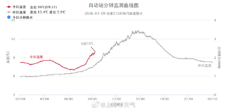 今天,上海白天春光明媚,气温上升较明显,预计最高气温可升至13℃。吹东到东南风,风力不大,在3~4级,午后户外体感比较温暖。