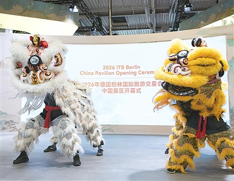 演员在2026柏林国际旅游交易会中国展区表演舞狮。新华社记者 张豪夫 摄