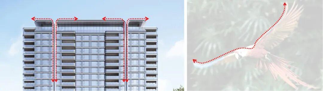 提取鹦鹉曲喙作为智慧与技术的视觉符号,运用于全景舱弧形窗系统。曲线幕墙最大化引景入室,提升视野开阔度与居住品质,体现科学与美学的统一。