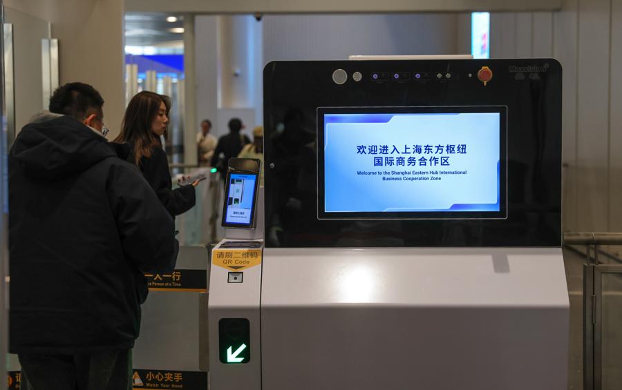 图为参会观众通过扫描展会注册二维码出入海关闸口。