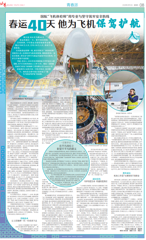 李超,北京人,2010年从中国民航大学毕业后入职国航,至今已在机务岗位上工作16年。他从一名机械员成长为北京飞机维修工程有限公司(Ameco)华北航线中心定检大队二中队中队长、技术骨干。他向北京青年报记者讲述了“我为飞机保驾护航”的故事。