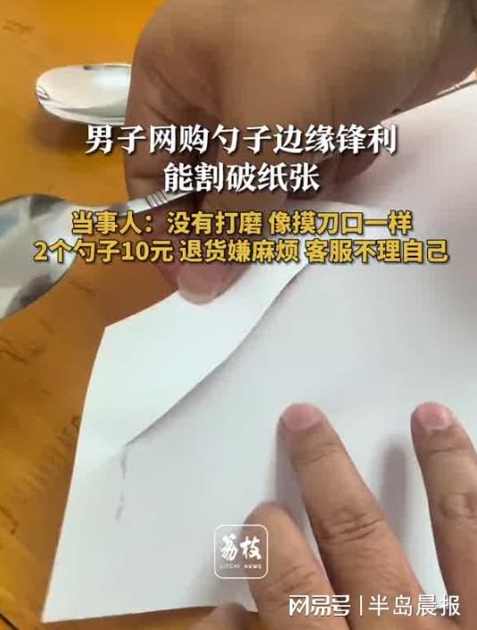 3月12日,广东深圳,袁先生称因孩子勺子旧了,在平台花10元买了2个新勺子。收货后发现勺子尾部未打磨,边缘锋利如刀口,试了一下轻松割破纸张。袁先生表示退货嫌麻烦,找客服反馈对方已读不回,提醒大家网购避雷。