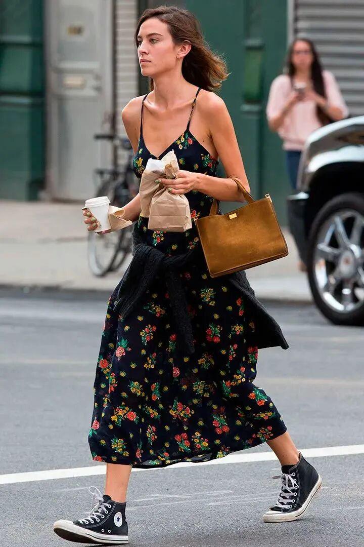 而且帆布鞋几乎普适任何材质风格的连衣裙,特别是一条浪漫的碎花连衣裙,单穿稍显乡村,用帆布鞋来缓解,反而甜酷的恰好。