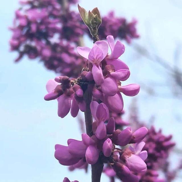 紫荆先花后叶,紫红色或粉红色小花2-10余朵成束,密密麻麻簇生于老枝和主干上,极富诗情画意。因小花形似紫粉色小雀鸟,甚为可爱,叶片心形,像两个心心相印的兄弟,因此紫荆也有兄弟树的美誉,象征家庭和美、骨肉情深。树皮、果、花皆可入药,但种子有毒不可误食。