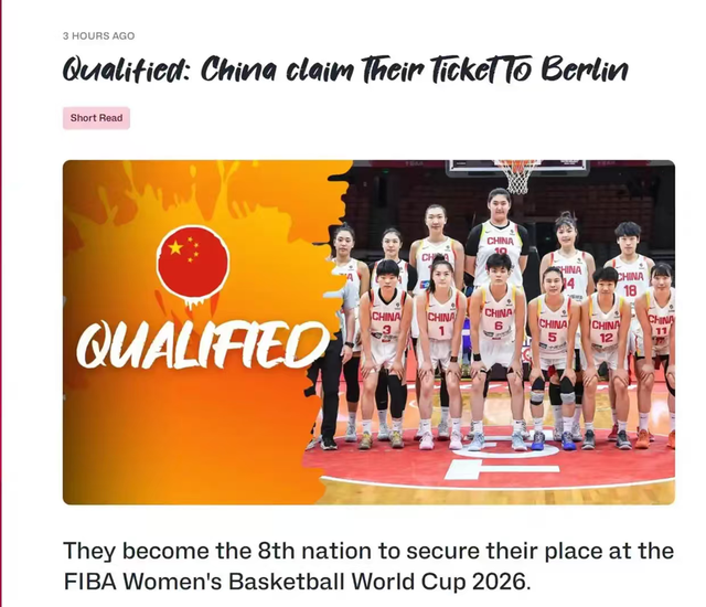 国际篮联在官网发文进行了祝贺,文章表示:中国女篮成为第八支获得世界杯正赛资格的队伍,也是首支通过资格赛获得世界杯正赛资格的队伍。文章还列举了中国女篮过往在国际篮联女篮世界杯上的成绩:曾11次参加女篮世界杯赛事,1983年首次参赛时就夺得季军,最佳成绩是1994年、2022年世界杯上获得的亚军。