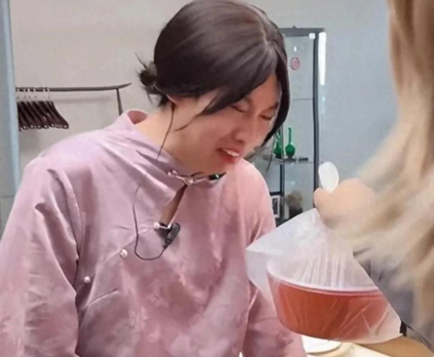 镜头前的他,坐在精致的餐桌旁,一边吃火锅一边对着观众说:“家人们,这个毛肚真的特别好,我自己天天吃。”