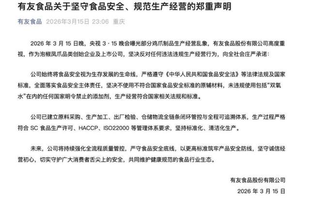 截至3月16日收盘,知名泡凤爪品牌、有着“凤爪第一股”美誉的有友食品跌0.80%,总市值47.77亿元,而就在3月15日晚间,央视刚曝光“漂白凤爪”不久,有友就第一时间回应称自己安全,但从股价走势来看,消费者的担忧,或仍未缓解。