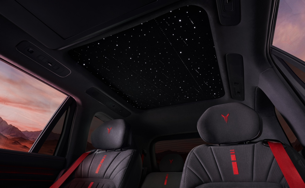 座舱内部将隐奢质感拉至满格。设计师以大面积墨色为底,在缝线与头枕等关键之处巧妙点缀丹砂红并采用层叠线条立体绗缝工艺,模仿铠甲片片相扣的精密感,中央更嵌入精致的红色高频焊图案。这一细节不仅拉满了百万级的奢华触感,更隐喻了藏锋于内敛之下的侠者风范。搭配高品质黑水晶钻石切割按键与流云墨韵饰板,细节处尽显藏而不露的高端格调。新车越级配备与百万豪车同源的星河天幕,598颗灯珠营造出静谧的星空仪式感,它将中式豪华的内敛之美推向了极致。