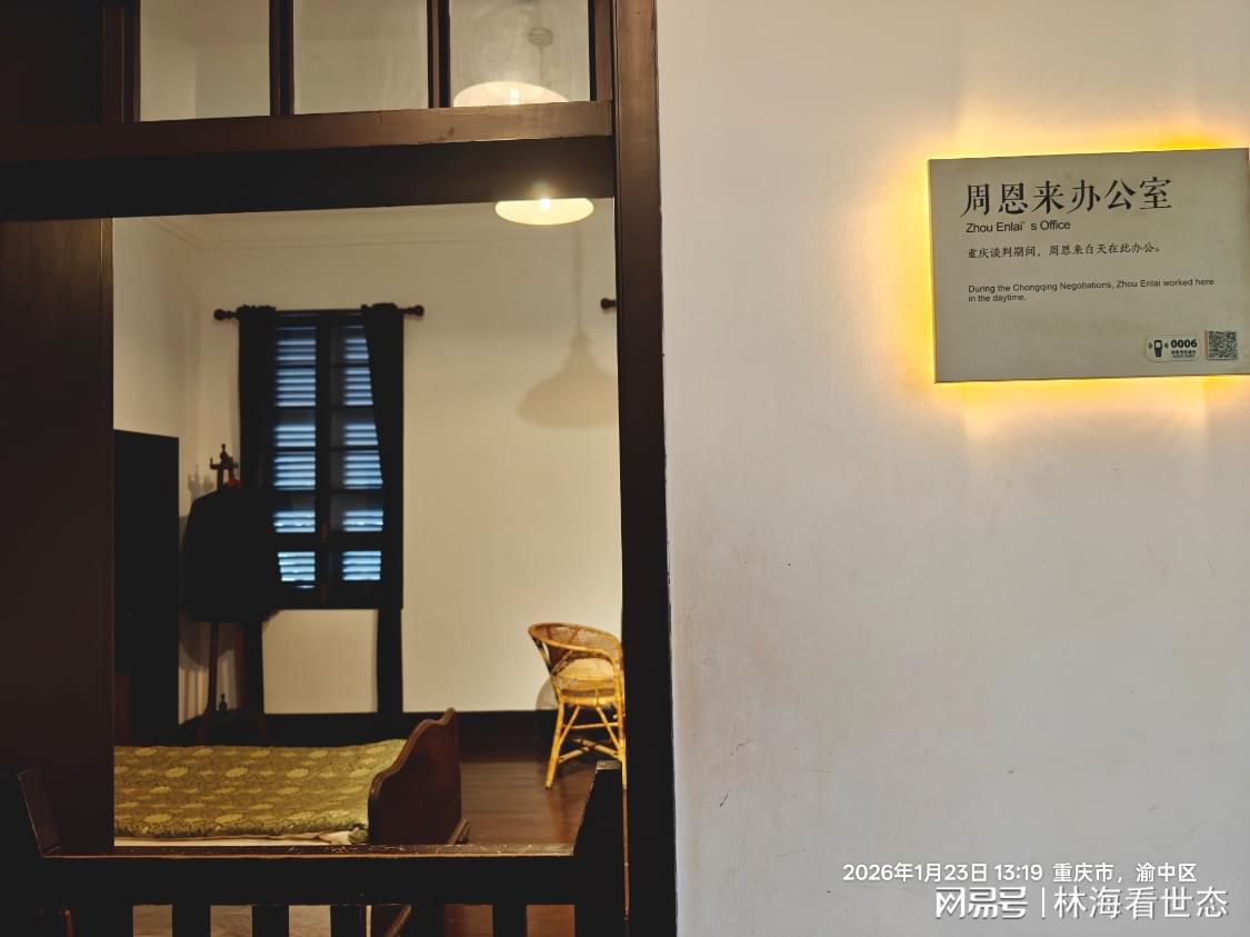 继续前行,中山四路65号的映入眼帘,刷身份证便可免费入园。这座占地700平方米的宅院建于20世纪30年代末,砖木结构的主楼中西合璧,砖墙砖柱搭配小青瓦顶,广漆木板铺地,院内两株桂花树每逢秋日便花香馥郁,“桂园”之名由此而来。谁能想到,这座清雅的宅院,曾是改变中国历史走向的“战场”——1945年8月,毛泽东携周恩来、王若飞等不顾安危飞抵重庆,为期43天的重庆谈判中,桂园成为毛泽东白天办公会客的核心场所。