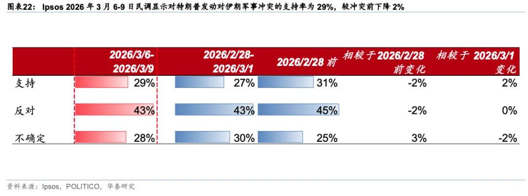 4. 美国国内政治压力变化:相比2003年伊拉克战争前,美国民众对本次冲突的支持率偏低(30-40%对比80-90%),随着冲突的展开,美国民众对冲突的支持率持续下降,目前不到3成。