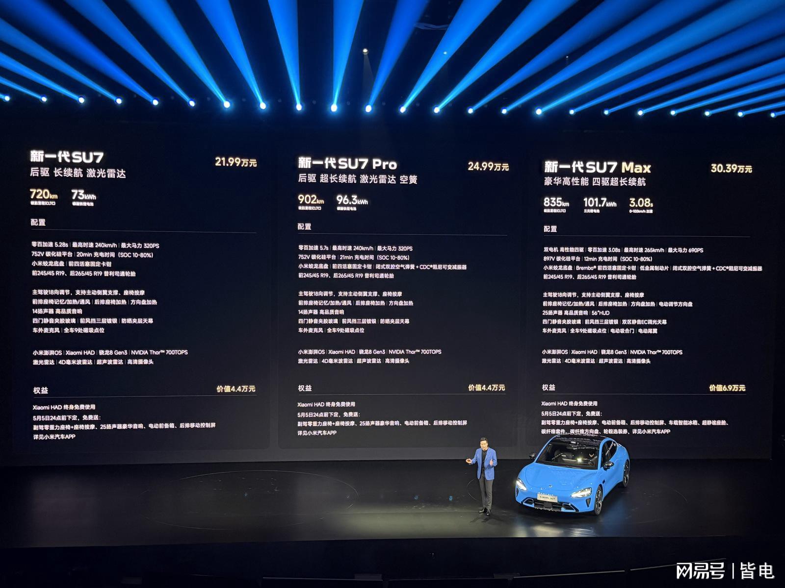 3月19日,电哥在现场关注新一代小米 SU7 上市,本次售价区间为 21.99~30.38 万元, 按照惯例提供了3 款车型配置,分别为SU7 标准版、SU7 Pro、SU7 Max。今晚 21:30 开始预订,定金 5000 元。