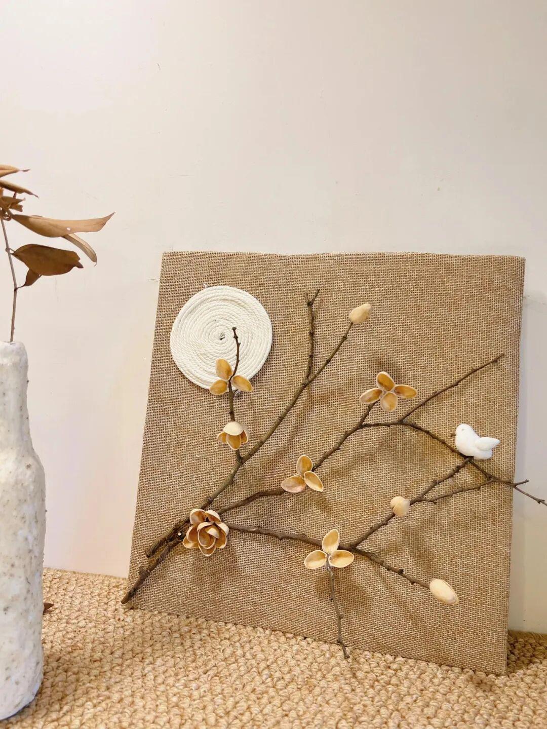 将树枝粘到画板上,再找根麻绳盘一个小造型,一个极具禅意的装饰画就做好了,一分钱都不用花。