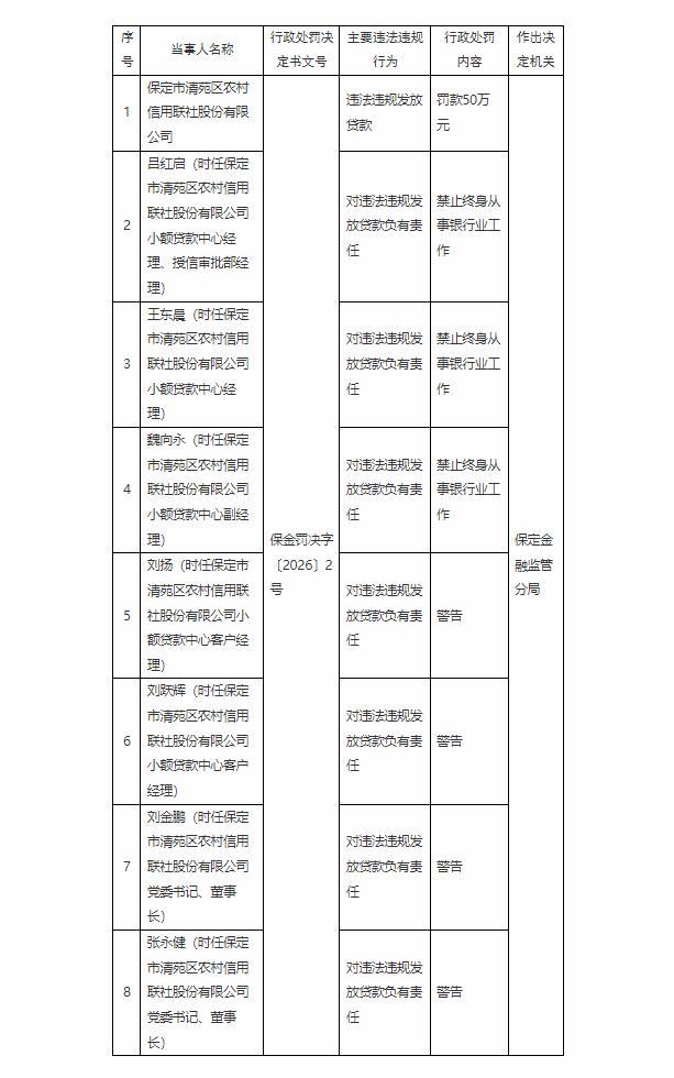 近日,国家金融监督管理总局保定监管分局发布保金罚决字〔2026〕2号行政处罚决定书,保定市清苑区农村信用联社股份有限公司因违法违规发放贷款,被处以50万元罚款,同时7名相关责任人被严肃追责,其中3人被终身禁止从事银行业工作,彰显了监管部门对信贷领域违法违规行为的“零容忍”态度。